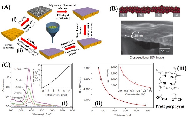 传统的分离技术包括蒸馏、变温/变压吸附和萃取,被广泛应用于生物制药、食品、农业、化工和石化等行业。然而这些能源密集型技术在生产过程中碳排放量巨大,容易造成二次污染。与之相比,膜分离过程具有低能耗,空间利用率高,分离过程无相变等优势。近年来,全球能源短缺和各种各样环境问题的出现,加速了膜分离技术的发展,尤其是利用纳米技术进行膜组装和膜分离技术的商业化。分离膜选择层的厚度和孔隙率对 于获得高通量的聚合物膜至关重要。传统的分子筛型超滤膜和纳滤膜大多具有较厚的选择层,其孔隙率低,孔径分布较为广泛,严重限制了其应用。近年来,科研工作者利用先进的纳米技术、新型的膜材料、膜制备技术和膜过程,逐渐可以制备出具有密集分子通道的超薄分离膜。这些膜的孔径在0.5~ 5nm之间,对于去除水或有机溶剂中的小分子具有非常理想的效果,并且具有高于传统分离膜几十或上百倍的液体通量,因此称之为超快分子分离膜(ultrafast molecular separation UMS)。