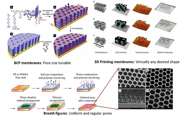 图6. (I) 具有均匀孔道的BCP 膜的典型组装过程,(II)3D打印成膜结构,(III) 呼吸图法典型过程