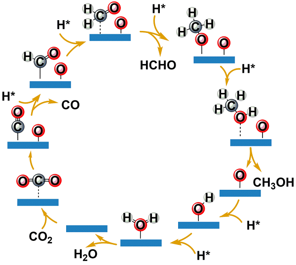 图3. 利用Cu聚集团和扩展面对甲醇进行CO2加氢机理反应机制