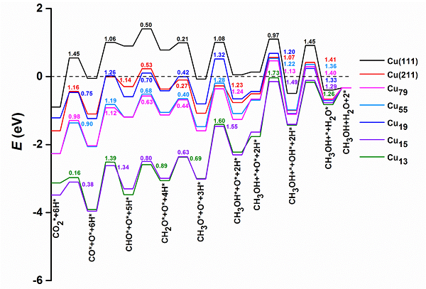 图4.对铜簇和扩展表面的二氧化碳减少的潜在能量表面(所有的基本反应界限以eV为单位表达)