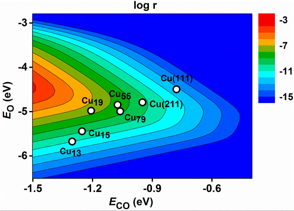 图5.二氧化碳还原反应速率(log r,以摩尔-1位移-1秒-1为单位)作为CO和O吸附能作用在铜簇和表面(T = 500 K; p = 0.05 bar; CO/O2 = 1:5)的函数。不同Cu预测的二氧化碳降低率粒子和表面被指示。