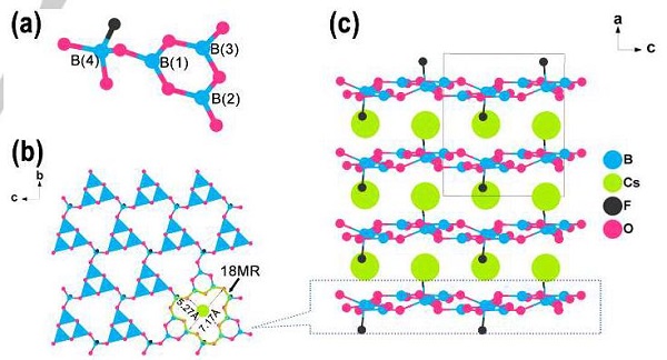 中国科学院新疆理化技术研究所潘世烈团队通过材料结构基元重组的设计思路,将BBO中的B3O6基元引入结构中,同时引入BO3F基元替代KBBF中剧毒的BeO3F,设计了新型非线性光学晶体CsB4O6F(CBF)。该晶体紫外截止边达到155nm,倍频效应为KH2PO4(KDP)的1.9倍(KBBF为1.2倍),具有大的双折射率,最短相位匹配波长预计达到171nm,且具有良好的热稳定性,是非常有前景的深紫外非线性光学晶体。同时,该晶体为同成分熔融化合物,容易生长大尺寸晶体,有利于产业化。