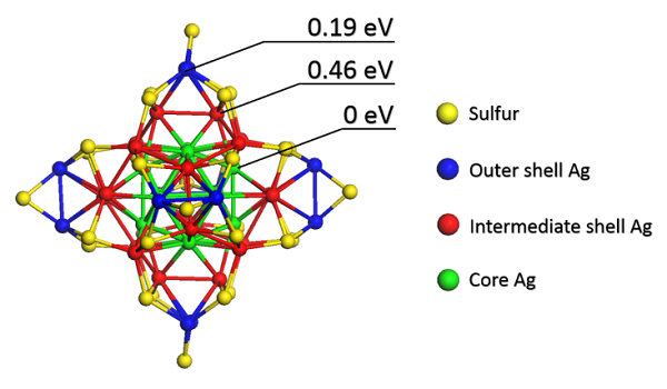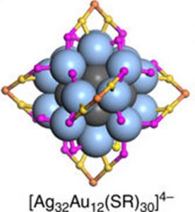 (合成的[Ag32Au12(SR)30]4-团簇结构示意图。灰球:内部Ag12团簇的银原子;灰蓝球:外部Ag20团簇的银原子;黄球:Au原子;洋红/橙色球:硫原子;)