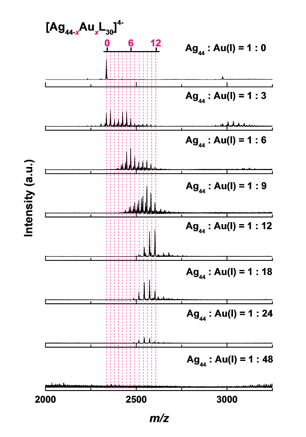 图2. [Ag44(SR)30]4-团簇与不同剂量的Au(I)-SR模体反应产物的质谱