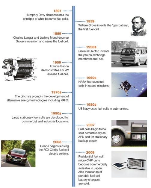 燃料电池最早于NASA在1960年代就在空间项目中应用了燃料电池。当时的燃料电池采用的技术为Alkaline solution fuel cell,采用KOH或者NaOH等混合碱溶液作为电解质。虽然电解质密度较高,但是电导率理想,价格便宜,已经比铅酸电池等强了不少。而且作为短期空间项目,碱溶液电解质生成碳酸沉淀的问题也不是问题,因此燃料电池的应用也还算成功。