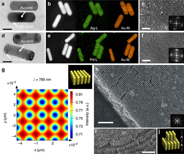 f) PdshelllAucore NRs四方对称超晶格SEM 图(scale bar为150nm);