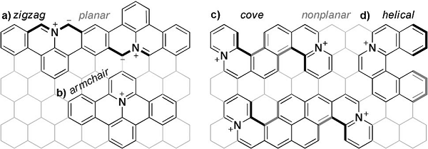 氮掺杂石墨烯由于其在催化、光学和电学方面的优异性能,广泛应用于燃料电池、太阳能电池、传感器和晶体管等领域。自下而上的有机合成技术使得制备出特定结构和物理性能的氮掺杂纳米石墨烯成为了可能。然而,由于合成难度大,含有吡啶和吡咯氮原子、阳离子的氮掺杂纳米石墨烯(CNDNs)更为稀少。近日,有学者报道了一种具有螺旋和凹型结构的CNDNs。纳米石墨烯的前沿分子轨道能量低,最低未占分子轨道(LUMO)稳定,与它的全碳类似物相比,电子亲和力更高,光学能隙更低。