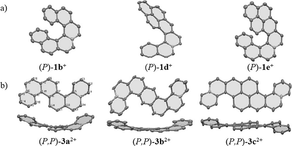 (b) (P,P)-3 a2+ (左), (P,P)-3 b2+ (中)和 (P,M)-3 c2+ (右) 的分子结构;