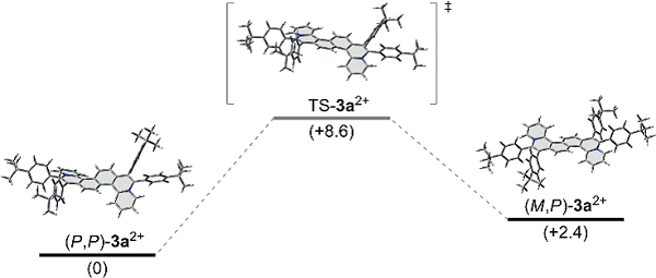 从图中观察可知,3 a2+从P,P异构体转变为M,P异构体。根据计算结果可知,初始的3 a’ (没有取代基)和相应的a”(没有取代基和氮掺杂) 有利于它们P,P和M,M异构体的形成。