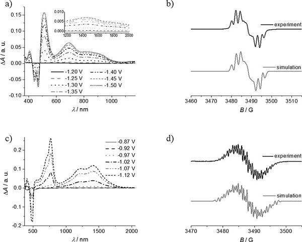 (a) 在1c+电化学还原期间所测量的紫外-可见-近红外吸收光谱;