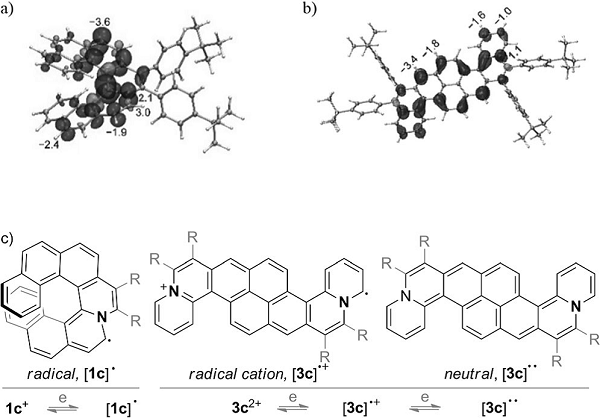 (a) DFT计算1c+自由基所得的自旋密度分布和超精细结合常数;