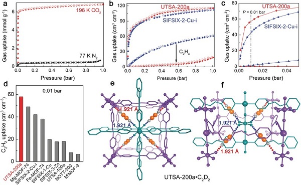 (c)模拟C2H4在UTSA-200a中的吸附,结果表明C2H4太大而不同通过孔;