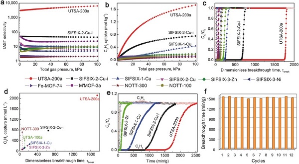 他们研究了SIFSIX-2-Cu-i的新变体材料SIFSIX-14-Cu-i(又被称作UTSA-200),通过极细微的孔径调节(3.4 Å),有效地排除了C2H4分子,而对C2H2分子具有较高的吸附容量58cm3cm-3(0.01bar、298K)。因此,该材料为吸附容量和选择性建立新的基准。利用它,1/99 C2H2/C2H4中C2H2分子的提纯容量最大值达1.18mmol g-1,并且可获得纯度为99.9999%的C2H4,比聚合级乙烯的纯度(99.996%)还要高。