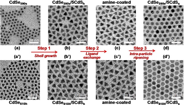 步骤1:由球形(a)或者六方形(a’) CdSe纳米晶外延生长生成六面体的CdSe/CdS核壳纳米晶体(b和b’)