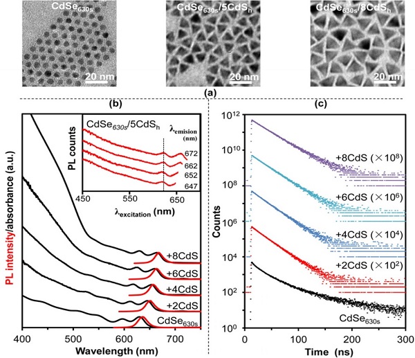 此外,这些量子点的CdSe核心在特殊操作和应用条件下,光化学性质很不稳定。宽禁带壳的外延生长是解决其光化学挑战的有利解决方法。CdSe/CdS是目前研究最多、发展最快的核壳量子点体系。CdS和CdSe形成I型能带偏移,价带顶(导带底)的CdS能量是∼0.5 eV比CdSe(∼高于0.3 eV)的低,提供了光生电子和空穴波函数约束的CdSe核量子点。但是,潜在的可能反应,特别是导带之间的CdSe和CdS是很有限的。这意味着CdSe/CdS核壳纳米晶的光学性质仍然对壳层厚度、核壳量子点的形状以及表面配体都很敏感。据推测,CdS的壳在波函数中的域应与CdSe核心量子点激子的动能密切相关。基于量子限域效应,后者取决于CdSe核心纳米晶的大小。虽然人们已经对CdSe/CdS核壳量子点进行了广泛研究,但是核尺寸效应、核形状、核壳量子点、壳层厚度和表面配体对其光物理和光化学性质的影响目前大多是未知的或者仅仅停留在经验水平上。
