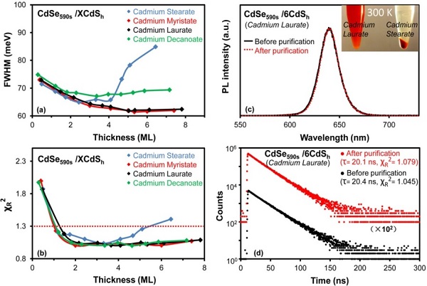 (b)χR2为核壳量子点与不同类型的镉烷酸酯生长的荧光发射衰减动力学单指数拟合