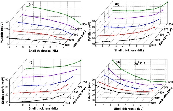 (a)特定的核心吸收波长与壳厚度的荧光光谱