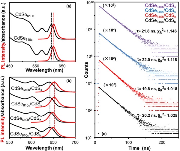 (b-c)具有不同核形状但在形状转换前后具有相同吸收峰的CdSe/CdS核壳纳米晶的紫外-可见光吸收光谱稳态荧光光谱和瞬态荧光光谱