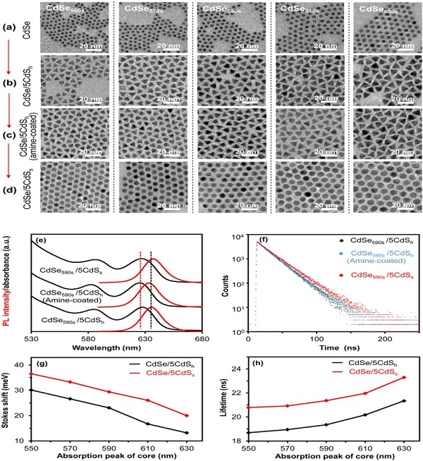 (g-h)CdSe/5CdSh和CdSe/5CdSs形状变化的斯托克斯位移和吸收峰荧光寿命