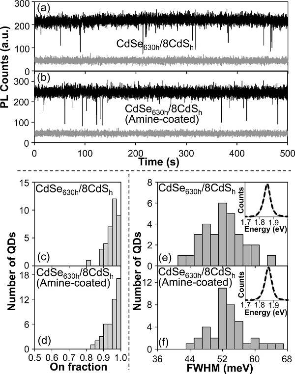 (a-b)配体交换前后CdSe630s/8CdSh核壳量子点的光强轨迹