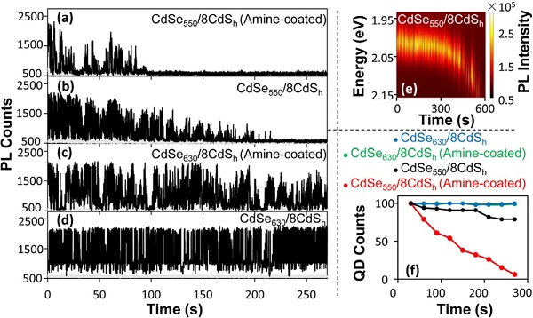(f)四种不同类型的CdSe/CdS核壳量子点的光漂白