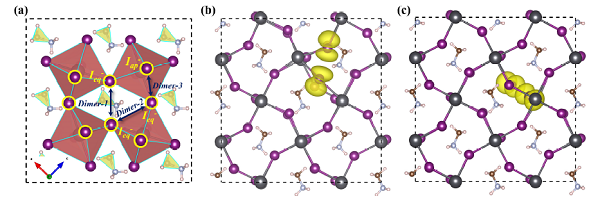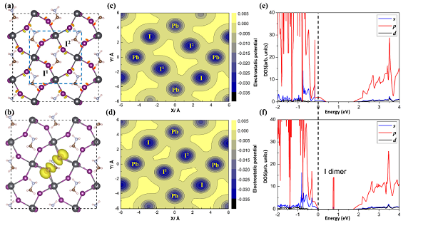 (a)CH3NH3PbI3正交相结构的俯视图。Iap–和Ieq–分别代表赤道方向上的I离子和顶部的I离子。图中展示了三种空穴被体系俘获所形成的I-I二聚体方式。I-I二聚体-1和I-I二聚体-2中的空穴均局域在两个Ieq–上,而I-I二聚体-3是由空穴局域在一个Ieq–和一个Iap–上构成