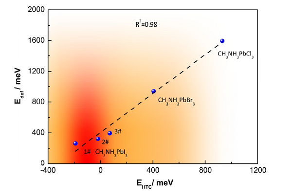 图4 CH3NH3PbX3 (X=Cl, Br, I)中X2–二聚体结构的空穴俘获能力(EHTC)和结构形变能(Edef)之间的线性关系