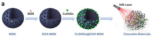此次,周民团队利用较大尺度的介孔硅(MSNs)纳米载体(约100nm),先将抗癌药物阿霉素(DOX)装载在纳米载体内部,同时利用超小尺度硫化铜纳米点(CuSNDs)(约5nm)进行包覆,形成复合的多级、多功能药物纳米级输送体系来解决这一问题(如图1),系列表征如图2所示。