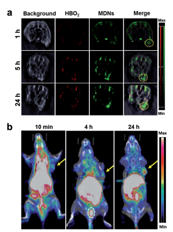 (a)不同时间点下,MDNs在动物体内的光声成像,肿瘤部位得到较强的光声信号(黄色虚线圈);(b)不同时间点下,MDNs的PET成像,随时间延长,肿瘤摄取逐渐增加(黄色箭头)