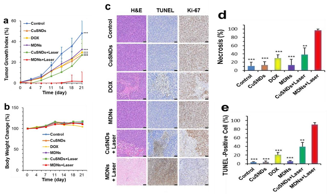 (a-b)肿瘤生长曲线和动物体重变化曲线;(c)不同处理组的免疫组化分析;(d-e)肿瘤坏死和Tunel阳性信号统计。