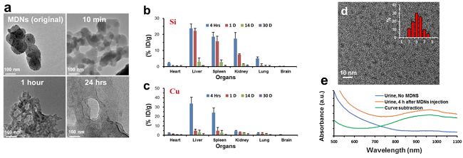 (a)NIR激光照射后MDNs在不同时间点的TEM照片,展示了MDNs随时间的降解过程;(b,c)尾静脉注射MDNs后(n=3),小鼠主要器官在不同时间点的硅和铜元素含量的分析;(d,e)尾静脉注射MDNs4小时后小鼠尿液的TEM照片和紫外分析结果。