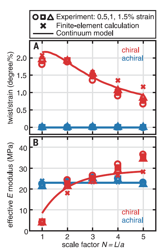 基于人造复合材料或超材料的合理设计,再加上三维(3D)微米和纳米加工的最新进展,使得材料逐渐突破机械性能的极限。自从有了机械超材料,研究的方向就一直向突破传统机械性能的方向发展,比如如何达到超低质量密度,超强材料性能,用于太空的可扩展材料,机械隐形保护或可重复使用的机械减震材料,可编程的机械特性,可重构性或非单向力隔离力等超乎想象的性质。对一个普通的线性弹性杆施加外力会导致它以多种方式变形, 然而,与静态情况下的旋光性对应的扭曲严格为零。这种自由度的不可用性妨碍了模式转换的应用以及使用坐标转换来实现先进的机械设计。
