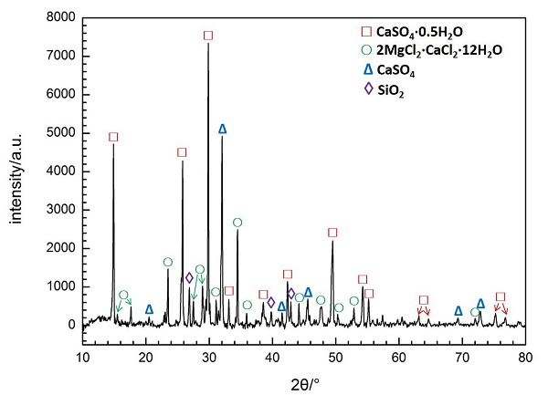泥浆中主要有CaSO4,CaCl2和MgCl2; CaSO4·0.5H2O峰最强