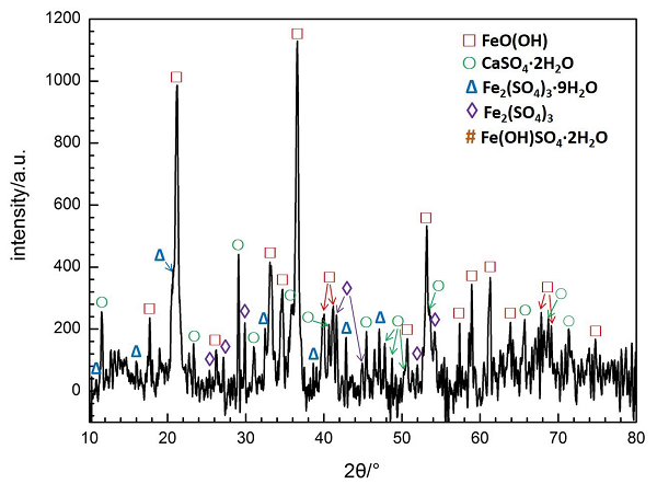 钢的腐蚀产物有:FeO(OH)、Fe2(SO4)3和Fe(OH)SO4;烟气中的 CaSO4沉积在钢上;FeO(OH)峰最强.