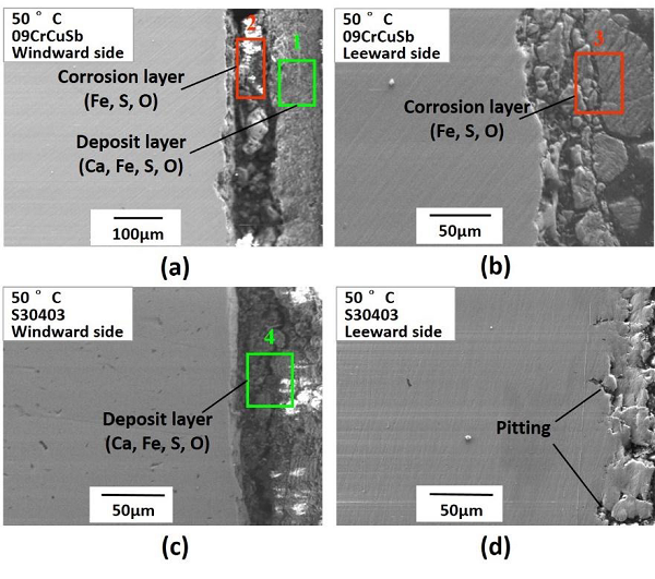 图5 低合金钢09CrCuSb和奥氏体不锈钢S30403在表面温度为50°C时的横截面SEM显微照片