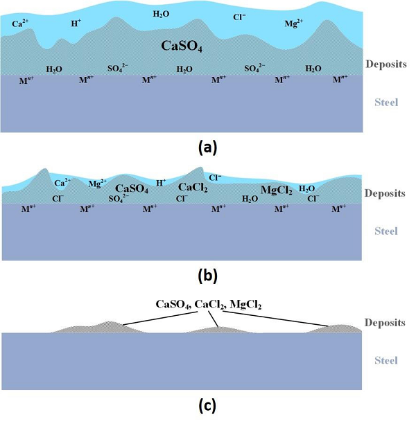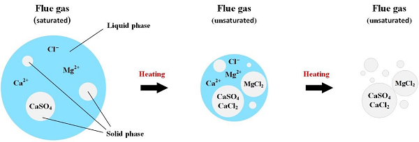 当接近高温表面时,会相继发生水分蒸发、液相浓缩和可溶性盐沉淀。 如果表面温度足够高,液滴可以在到达钢表面之前蒸发至干燥。