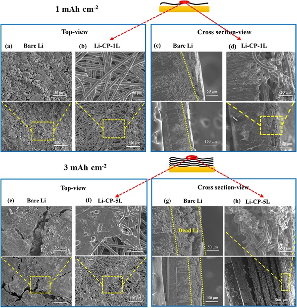 (a)在有3 mAh cm-2 容量极限的3 mA cm-2电流密度下,Li-CP-5L和纯Li箔的循环稳定性和电压;