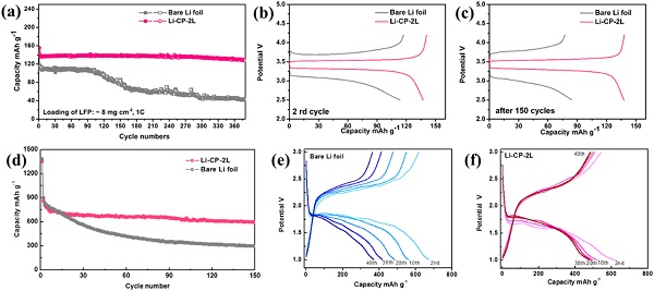 (d) 使用纯Li箔和Li-CP-2L,全电池的循环性能;