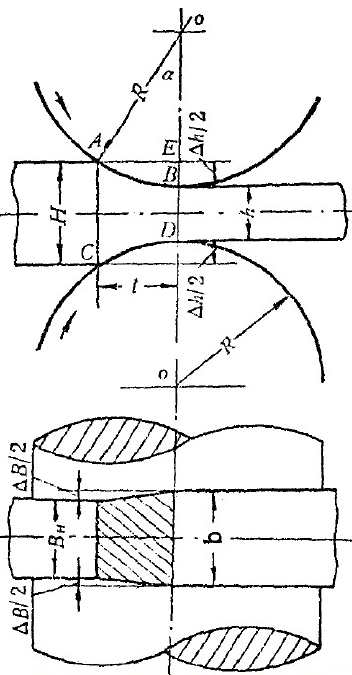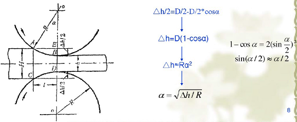 2)变形区长度轧件和轧辊接触圆弧的水平投影长度。两轧辊直径相等时: