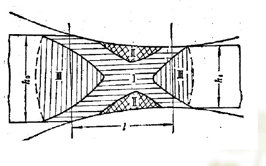 图6 轧制变形区Ⅰ-易变形区;Ⅱ-难变形区 ; Ⅲ-自由变形区