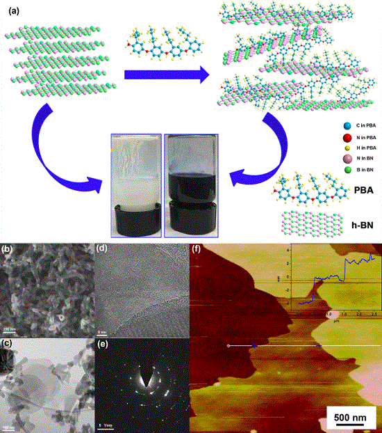 图1.借助PBA将h-BN分散在四氢呋喃(THF)中的示意图及PBA、h-BN的形貌结构表征