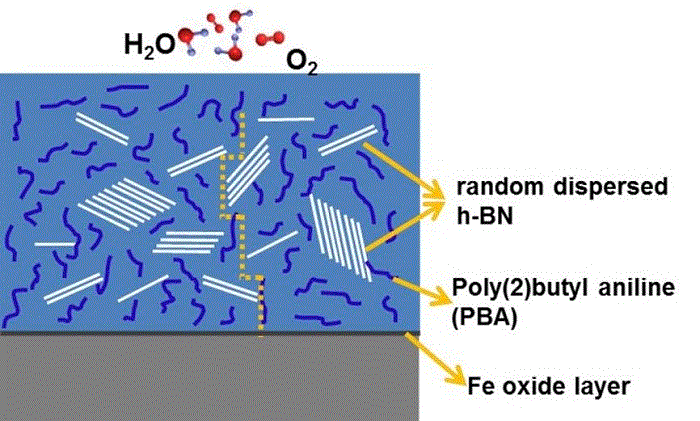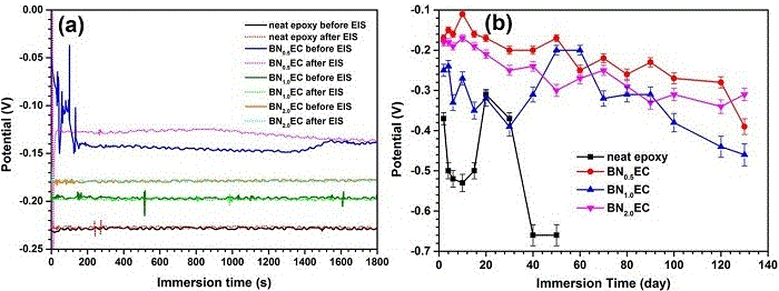 BNxEC系统的保护机理如图10所示。一方面,少量h-BN纳米片(h-BN的含量为0.5〜1.0wt%)随机分散在涂层中会产生一个“迷宫” 效应,它能有效增强涂层的阻隔性能,从而曲折扩散路径并抑制腐蚀介质的渗透。 另一方面,PBA的添加不仅实现了h-BN在环氧树脂基体中的随机分散,而且还作为电活性材料,通过钝化金属表面实现对基材的保护。