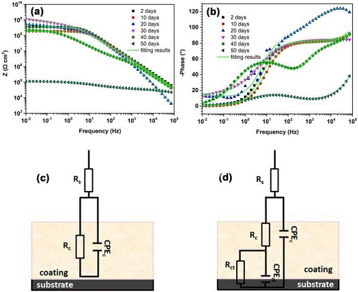 图4. 纯环氧树脂不同浸泡时间的EIS结果和相应的等效电路(EECs)