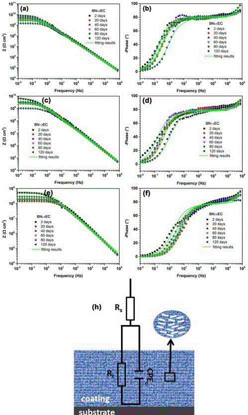 (a-f)BNxEC涂层在3.5wt%NaCl溶液中浸泡不同时间的波特图(a / b:BN0.5EC; c / d:BN1.0EC; e / f:BN2.0EC;)