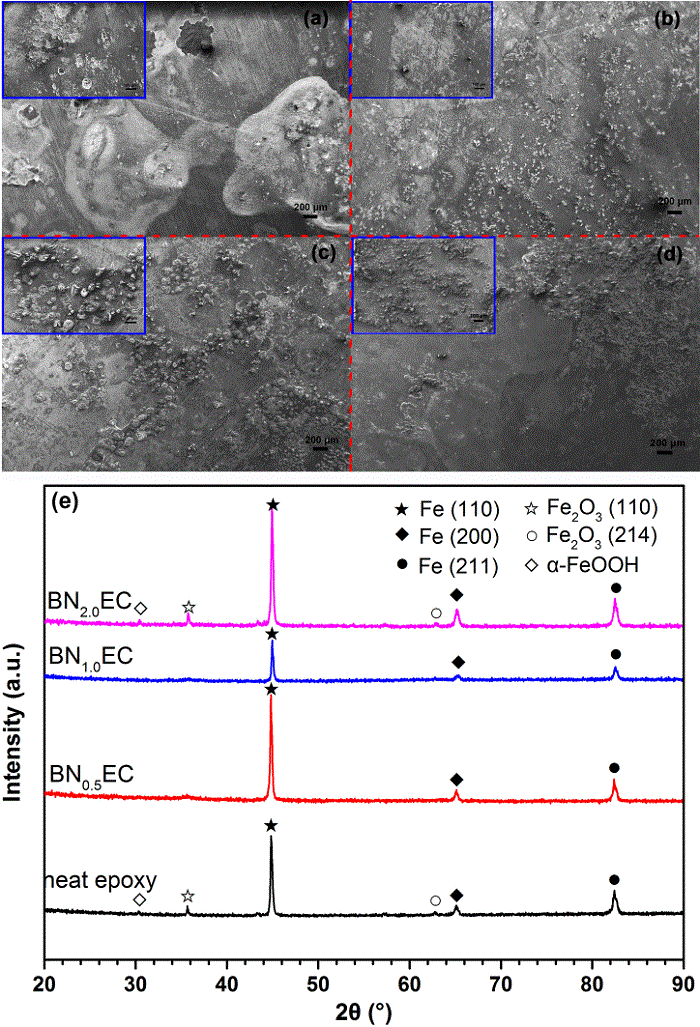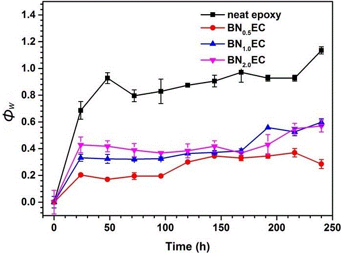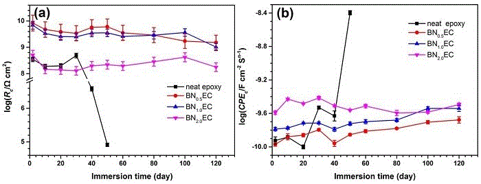 (注BNxEC中x表示的意义为环氧纳米复合涂层中h-BN纳米片的含量:如以相似的方式制备具有不同含量的h-BN纳米片(0.5wt%,1.0wt%和2.0wt%)的环氧纳米复合涂层,命名为纯环氧树脂,记为BN0.5EC,BN1.0EC和BN2.0EC)