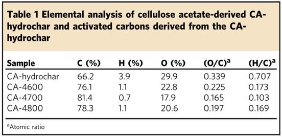 表1 醋酸纤维素水热碳化得到的CA-hydrochar以及活性碳材料(CA-4T)的元素分析
