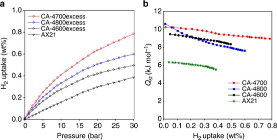 活性碳材料(CA-4T)与商用活性碳材料(AX21)的储氢容量:(a)饱和质量分数(25oC下);(b)等温吸附热与储氢量之间的关系。