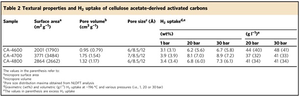 本文通过水热碳化醋酸纤维素,再经过活化得到富氧多孔碳材料。它具有高的表观比表面积(3484 m2g-1),其中92%来自于微孔,其中只有很少部分孔的孔径大于20Å。IR和XPS证明了含氧官能团(COOH、C-OH、O-C=O)的存在。与其他原料(比如纤维素、木质素、木屑、淀粉等)制备得到的碳材料相比,富氧特性和高微孔率是醋酸纤维素得到的多孔碳材料的特性。由于高比表面积、高微孔率以及富氧特性,多孔碳材料展现出优异的储氢性能。该多孔碳材料的储氢容量刷新了当前多孔碳材料储氢量的记录,并超过了所谓的活性碳储氢容量的上限。该研究为水热碳化路线中前驱体的作用提供了新观点,并且验证了富氧特性对多孔碳材料储氢性能的好处;还为碳材料用于储氢开启了新的研究方向。