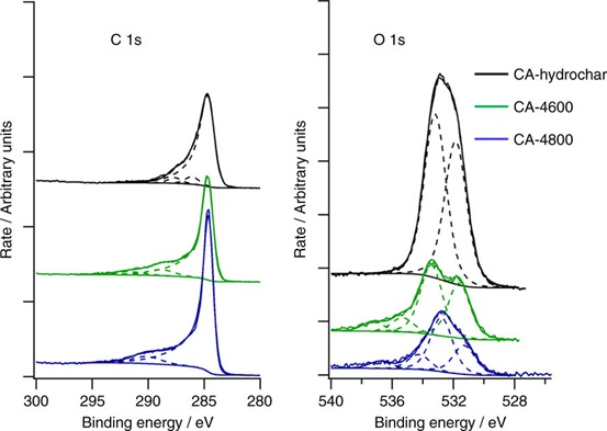 CA-hydrochar和活性碳材料(CA-4T)的C 1s和O 1s的XPS图谱。