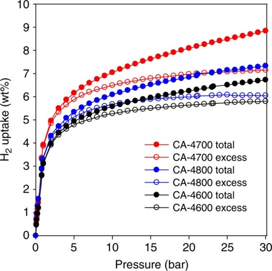 近日,英国诺丁汉大学的Robert Mokaya(通讯作者)等人制备了具有高比表面积、高微孔量以及相近孔径的富氧多孔碳材料,并研究了它们的储氢性能。研究成果发表在Nature Communications上,题为“Oxygen-rich microporous carbons with exceptional hydrogen storage capacity”。研究中,分别采用醋酸纤维素(简写为CA,其O/C原子比为0.93)和纤维素作为原料,首先在250oC下进行了水热碳化(HTC),以便最大化碳产量同时保持高的含氧量。HTC处理得到无定形碳(简称为CA-hydrochar)后,在不同温度下进行活化处理得到最终的活性碳材料(简称为CA-4T,其中4表示活化处理时KOH/C的比例,T表示活化温度),即富氧多孔碳材料。结果表明,以醋酸纤维素作为原料得到的活性碳材料含氧量更高(18-23wt%)。根据拉曼测试,该方法制备得到的富氧多孔碳材料石墨化程度很低。另外,研究人员表征了多孔碳材料的孔结构。值得注意的是,多孔碳材料的比表面积和孔体积都较大,同时保持了较高的微孔率(92%)。这是目前活性碳材料中的最高值。与其他原料制备的活性碳材料进行了比较,结果表明,除了富氧特性,醋酸纤维素作为前驱体制备得到的多孔碳材料具有更高的比表面积和微孔率。最后,他们研究了低温且不同压力下的储氢性能,并与典型金属骨架材料的储氢性能进行了比较。在-196oC温度和20 bar的压力下,富氧多孔碳材料的储氢总质量分数为8.1 wt%、饱和质量分数为7.0 wt%;当压力为30 bar时,总质量分数达8.9 wt%。上述质量分数换算成体积分数,分别是44 g l-1(压力20 bar)和48 g l-1(压力30 bar)。他们还研究了室温下的储氢性能和等温吸附热,进一步验证含氧量对氢气吸附的作用。富氧多孔碳材料在室温下的储氢量大于商用材料(AX21)的储氢量。富氧多孔碳材料的等温吸附热大于10kJmol-1,大约是目前典型活性碳的2倍。
